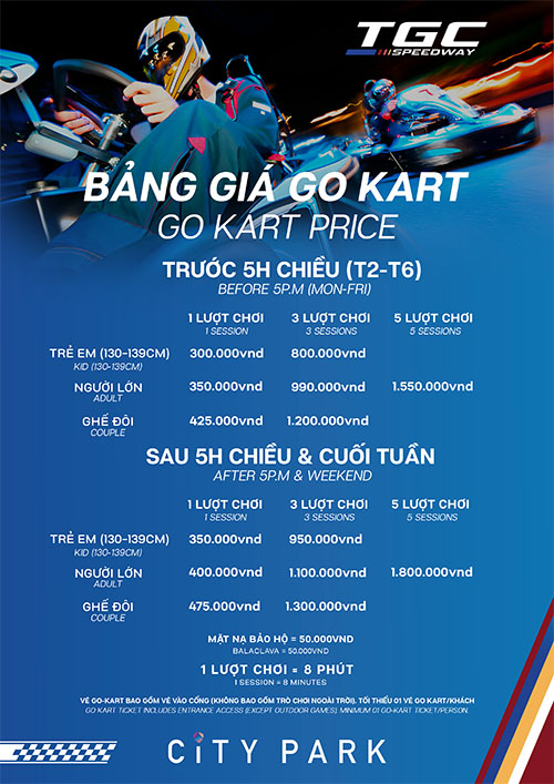 Giá vé Go Kart Global City được thiết kế phù hợp với nhiều đối tượng, dao động tùy theo thời gian và loại xe: